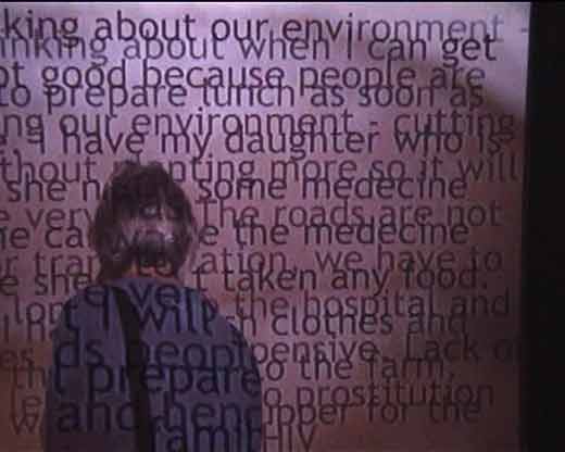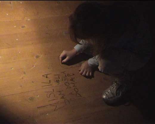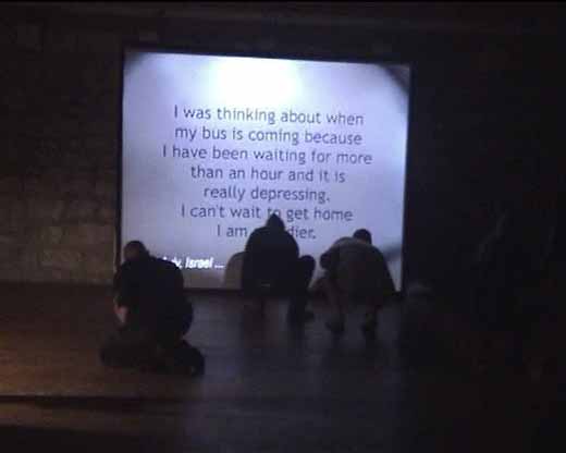 October 2007Before entering the performance space I gave each viewer a piece of charcoal and whispered in their ear ‘what are you thinking?’ On entering the space, they saw a projected slide show of ‘thoughts’ I had collected through random encounters in the streets of Moshi, Tanzania, in Tel Aviv, Israel, in Carlisle, UK and in Torun, Poland. A computer screen showed the thoughts I had collected during the day in Dubrovnik. The viewers added their own thoughts by writing on the floor with the charcoal.