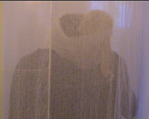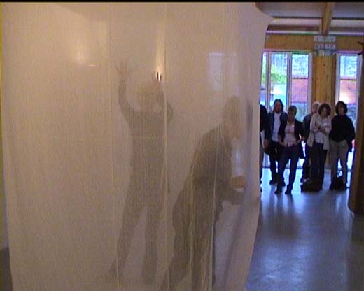 October 2000This was the first of a series of collaborative works with artist Jane Dudman. We had recorded our voices making abstract voice sounds independently in different outdoor locations. This recording was playing whilst we made the 20min long action. We entered and then sewed ourselves into a muslin tent. Using strips of muslin we covered and uncovered each other in different poses.