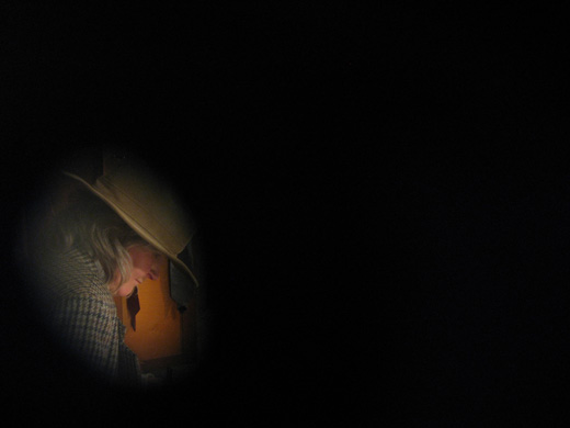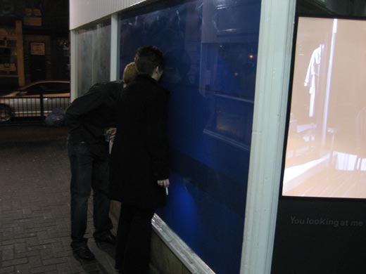 The performance was in an empty shop and was mediated through film that was projected live on the opening night of this exhibition. The spy holes provided the proof that the camera was filming me live. The installation resulting from the live action continued to be visible through the spy-holes while the now recorded performance was projected onto the window.
